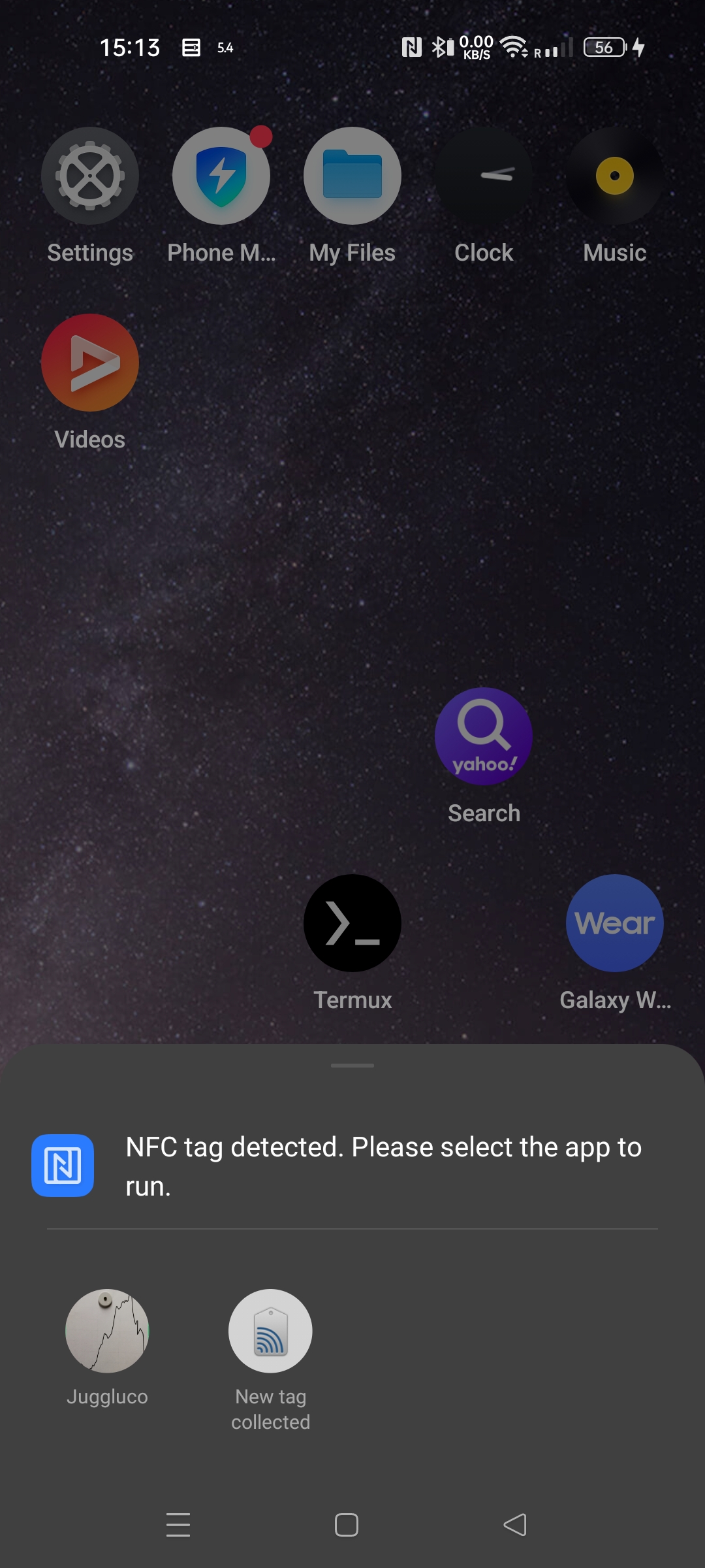 Коли ви прикладаєте задню частину ручки до NFC-сенсора у телефоні без Juggluco на передньому плані, з'являється вибір Juggluco та "Новий тег зібрано".